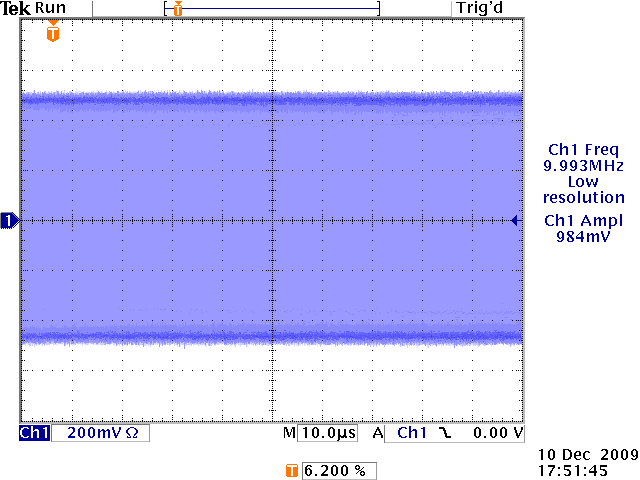 Now, let's try more complex waveforms. First, a 10 MHz square wave @ 20ns/div, and then with 4 ms/div single sweep: