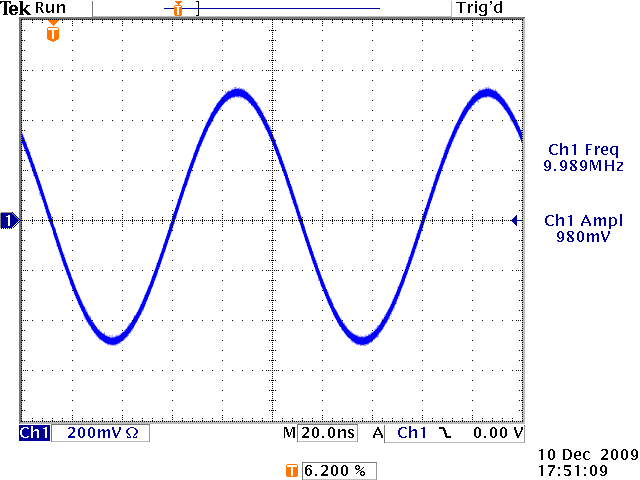 Wait a minute, measurement says now that our 10 MHz signal has turned into 57 Hz one! What if you wanted to measure some kind of an amplitude modulation from 10 MHz carrier? The amplitude and waveshape are quite correct. The only artifact seems to be that the scope seems not to trigger on the sinewave even if the settings are appropriate. Let's do a single sweep: