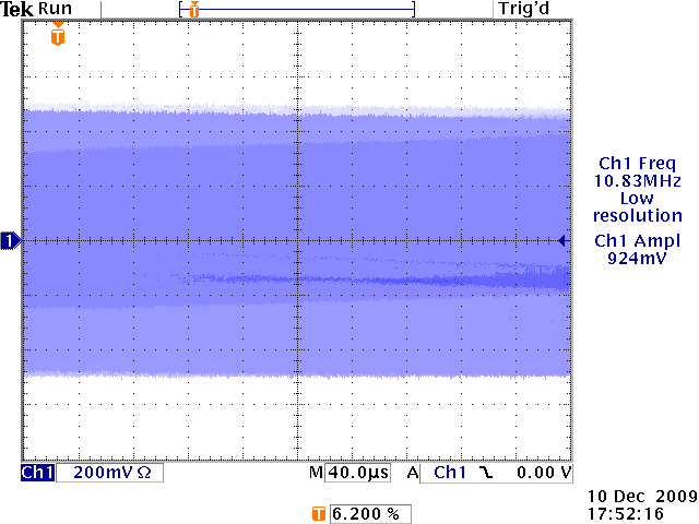First, a sample of the RF-signal at 100 ms/div. Note the sample rate in bottom right, 4 MSa/s should result heavy aliasing, as the carrier is very much above Nyquist frequency.